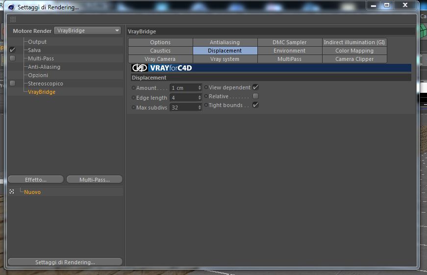 Stai usando Vray? Presumo di sì, visto che hai postato nella Sezione dedicata a Vray..........Quindi: come hai impostato il displacement nell'apposito tag?