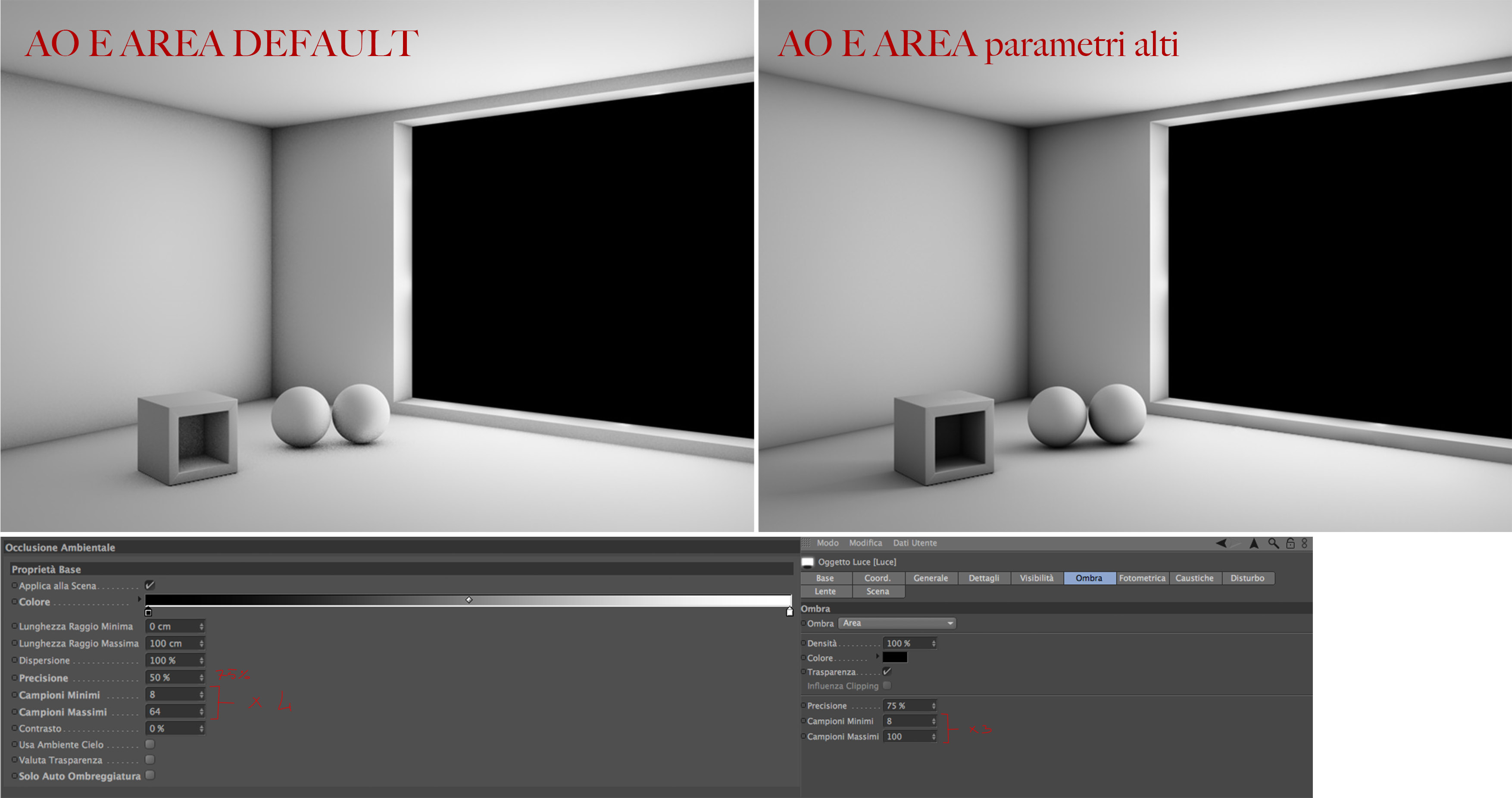 l'ambient occlusion... idem, per render architettonici non ha motivo di essere inserita in scena a meno che uno non voglia rappresentare un ambiente vecchio e sporco dove qualcuno si è divertito a pitturare di grigio gli angoli dei muri