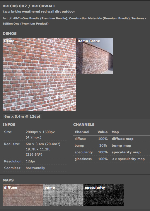 -la texture del muro facciavista: ho utilizzato le texture dal sito arraway con i parametri classici, allego immagine del sito, lo speculare non l'ho modificato ed è impostato sul modo plastico , 50%, 20%, 0%, 0%
