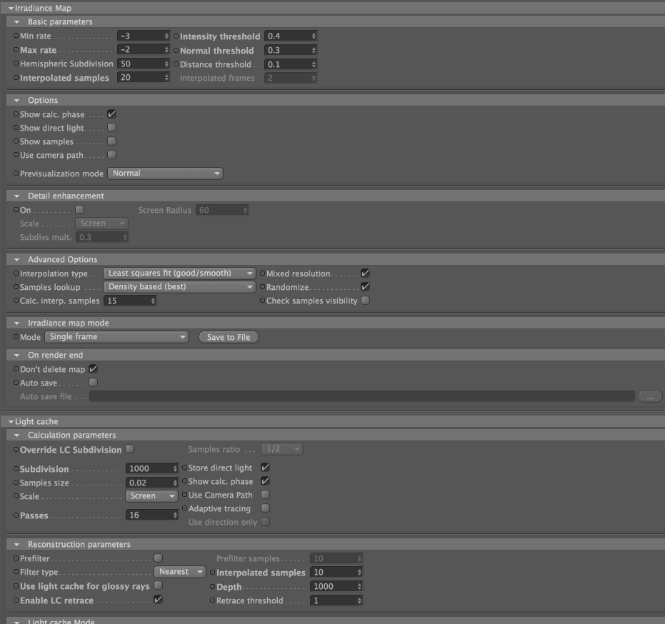 @anto3d: metto le impostazioni che ho usato. Il molto buio è anche dovuto al fatto che nn volevo un render sparato di luce ma volevo un'atmosfera più in "penombra"...