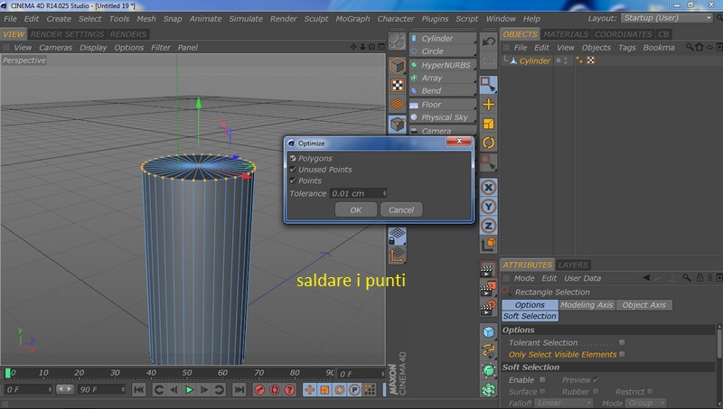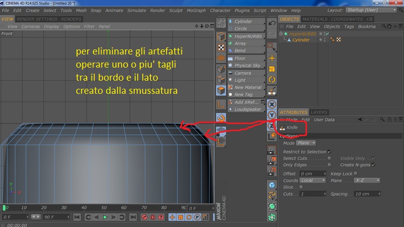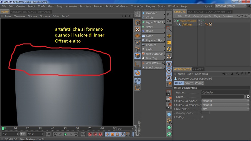 Poi però se metti il cilindro sotto un'HyperNURBS è facile che si creino dgli artefatti (un raggrinzimento): per eliminarlo devi operare un taglio con il Knife vicino al bordo............