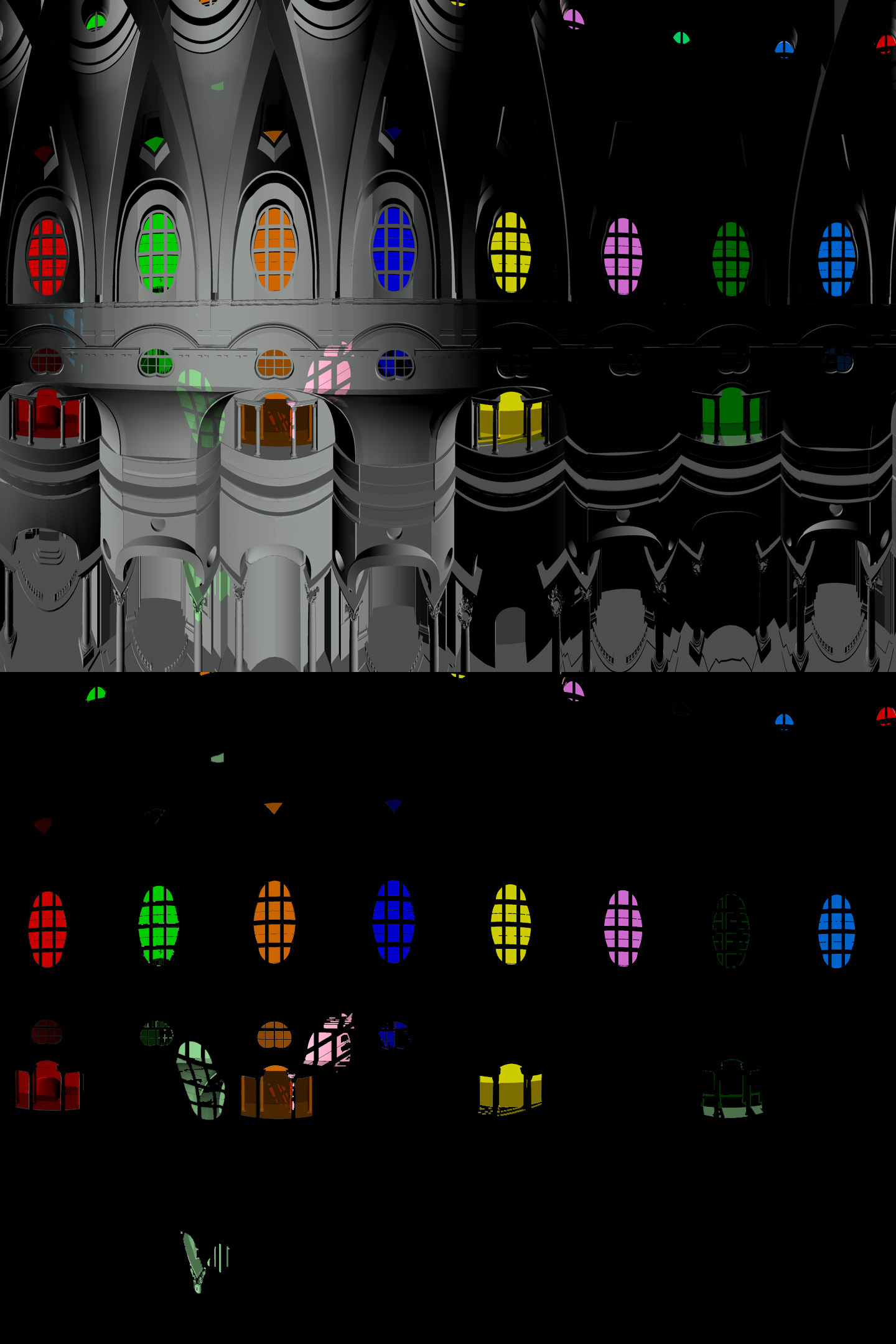 Immagine sopra: sole attivo, ma nonostante la global illumination sia attiva si nota comunque le parti in luce e in ombra che mi fanno identificare la chiesa, cosa che io non vorrei, perché solo ottenendo una immagine in cui si evidenzia solamente le luci colorate delle finestre e le relative proiezioni a terra e sui muri riesco successivamente, in premiere, con l' attivazione di un canale alpha al quale assegno una maschera di colore nero, posso sovrapporre all' immagine bianca e neurta della chiesa per così far vedere dove e come si evolvono le luci senza che si schiarscia e scurisca la chiesa.
