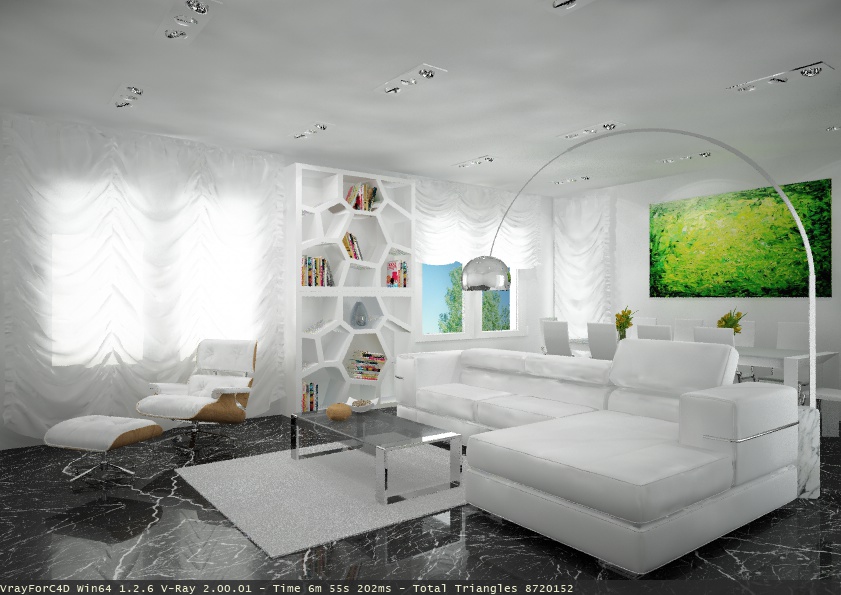 Tutto molto... Bianco ! Forse il divano o la libreria la farei di un altro colore per riprendere il pavimento.