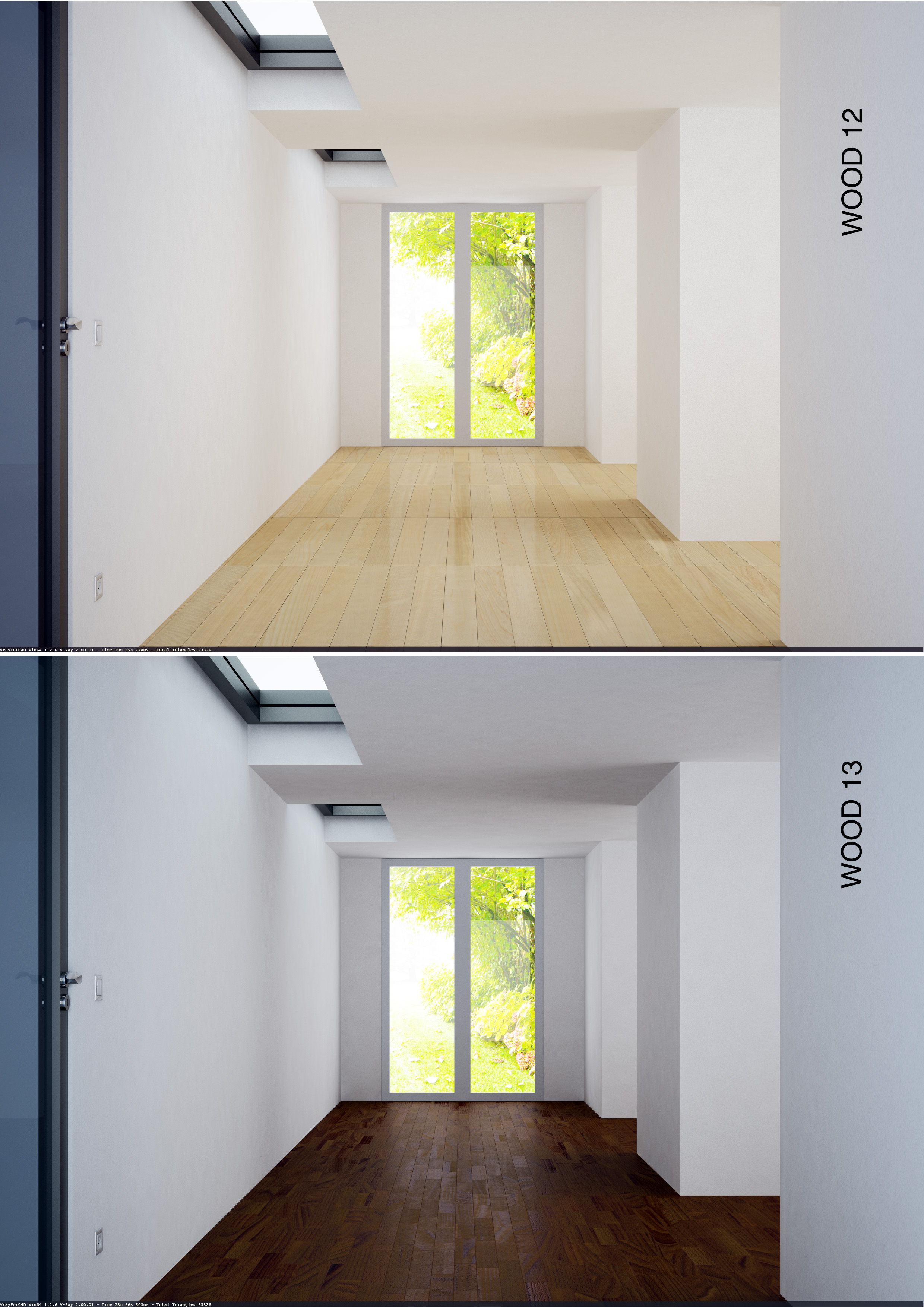 Ad essere sincero mi piace anche l'illuminazione... forse l'unico a sembrare "finto è il wood32"... la riflessione è alta calcolando che si vede la portafinestra sul pavimento come se ci fosse stampata... secondo me la riflessione dovrebbe essere più simile a "wood13"... bel lavoro!!!