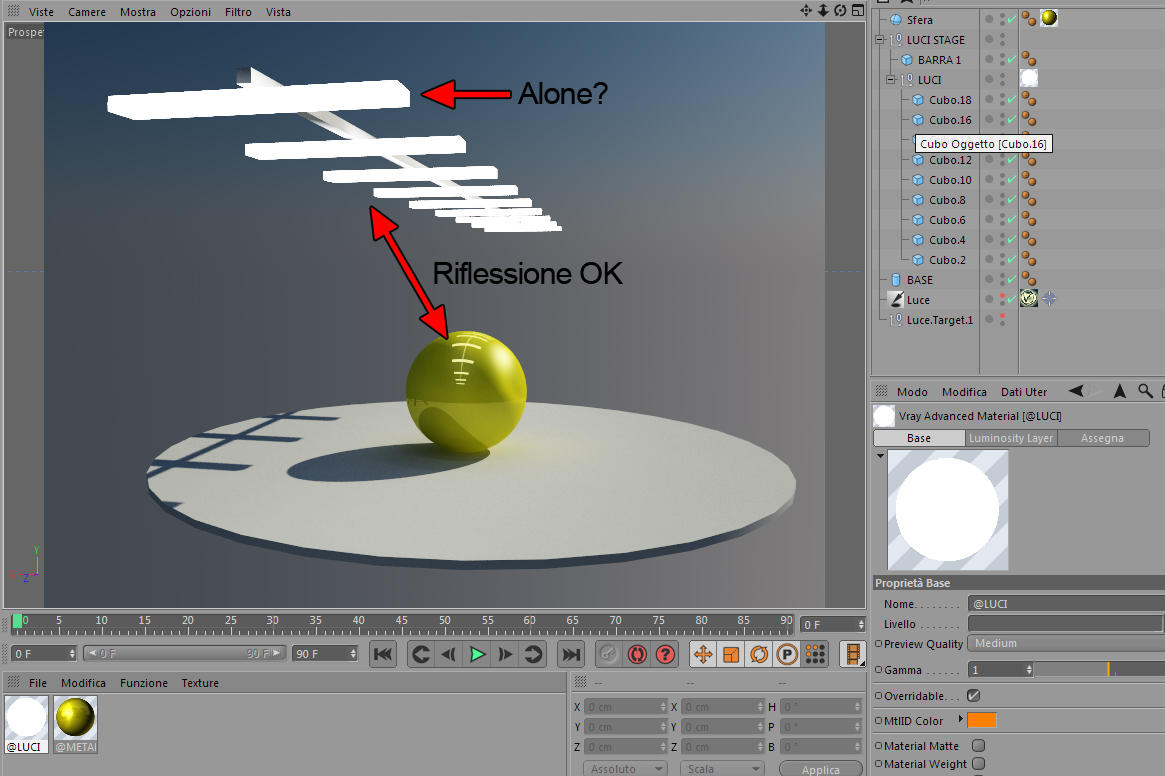 Comunque ho risolto in parte; il mio problema era questo: far riflettere sulla carrozzeria dell'auto delle lampade che "abbagliano" come in figura; ho "acceso" il materiale settandolo come in figura e il materiale riflette bene, solo che vorrei aggiungere l'alone proprio come se fossero delle lampade accese.. come fare?