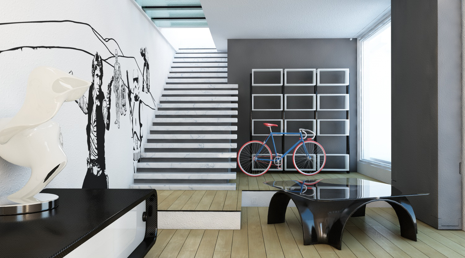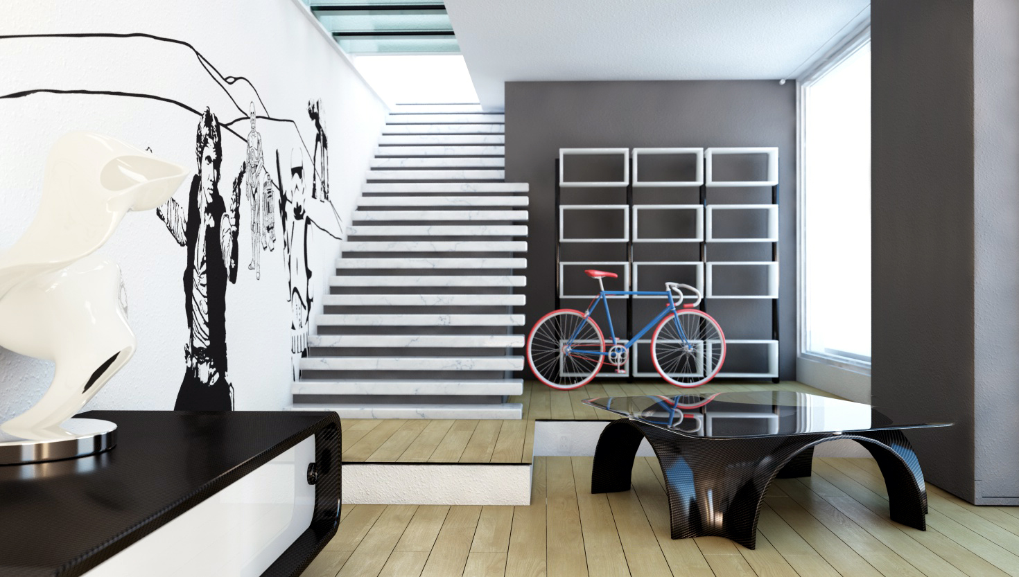 per me la bicicletta non ci azzecca con la scena e le pareti sono troppo bianche con un retouch in ps mi pare gia meglio