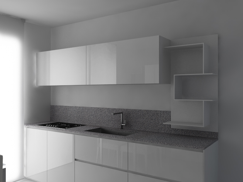 ho un problemino con la riflessione delle tende sui pensili di questa cucina, appaiono sgranate e non una riflessione pulita.
