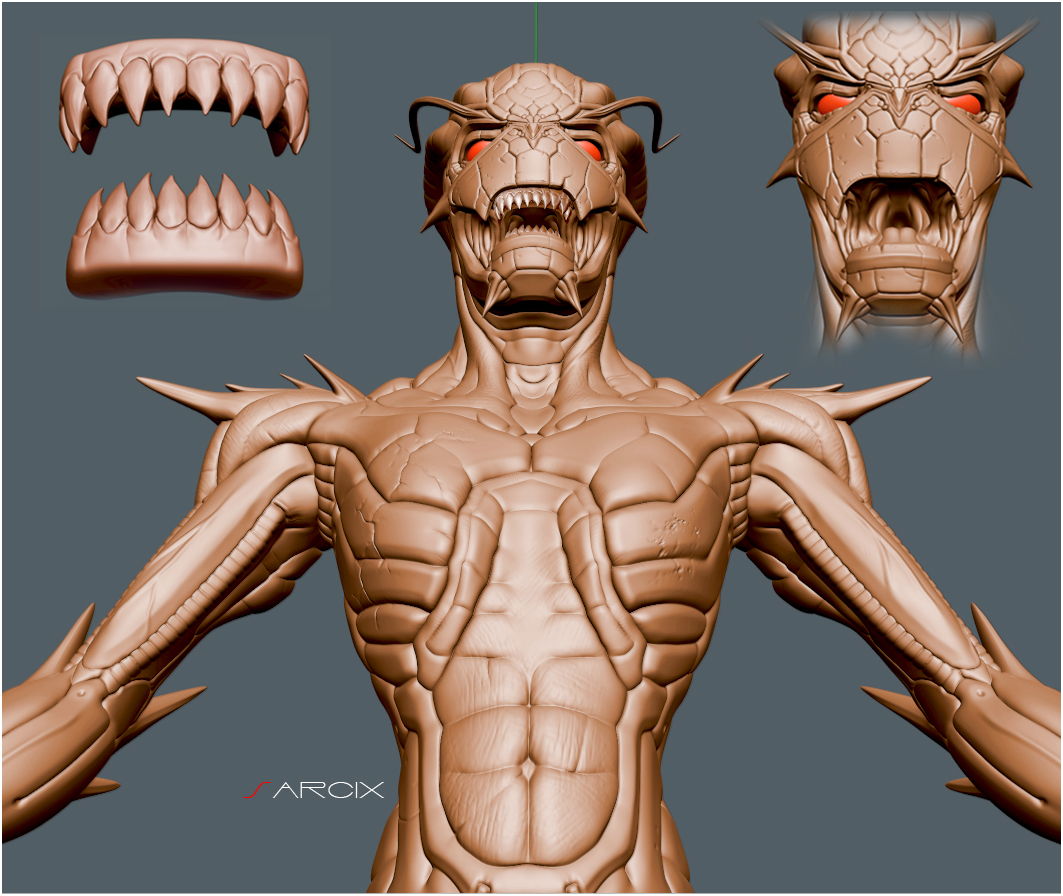 Strada 1-scendi un pò di risoluzione ed inizi a dipingere in Body Paint, esattamente come se fosse un modello normale! Lo sculpt non interferisce con la pittura, e risalendo poi di suddivisione puoi dare gli utlimi ritocchi.
