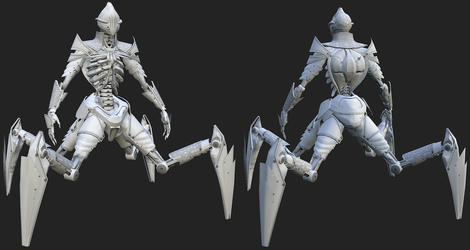 Ora manca 'solo' il baking dall'hipoly e dipingere le textures, prima però andrò ad aggiungere quell'ultimo livello di dettaglio al modello hipoly che darà 'vita' al personaggio, e che non inciderà sulla silhouette del modello lowpoly (erosione, graffi, ammaccature, ecc..)