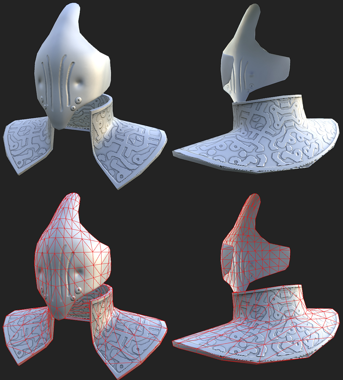 Gran parte dell'armatura, realizzata quasi prettamente in cinema, è già bella che pronta e solo da ottimizzare togliendo gli edges di controllo inseriti per avere lo smooth desiderato in zbrush!