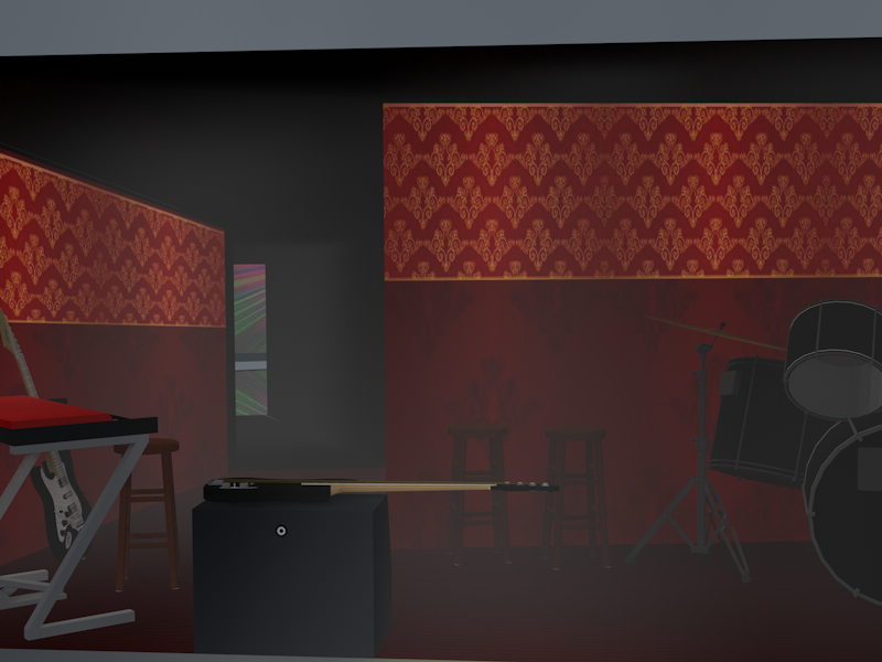 1. è un'immagine presa da un tunnel, dovrebbe rappresentare una sala prove improvvisata, carta da parati kitsch anni 70 e moquette per terra, con gli strumenti appoggiati a caso..