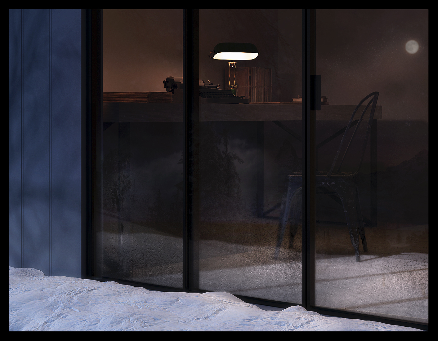 Bello l' effetto di luna e alberi sui vetri. L'hai aggiunto in post? Background? o altro..