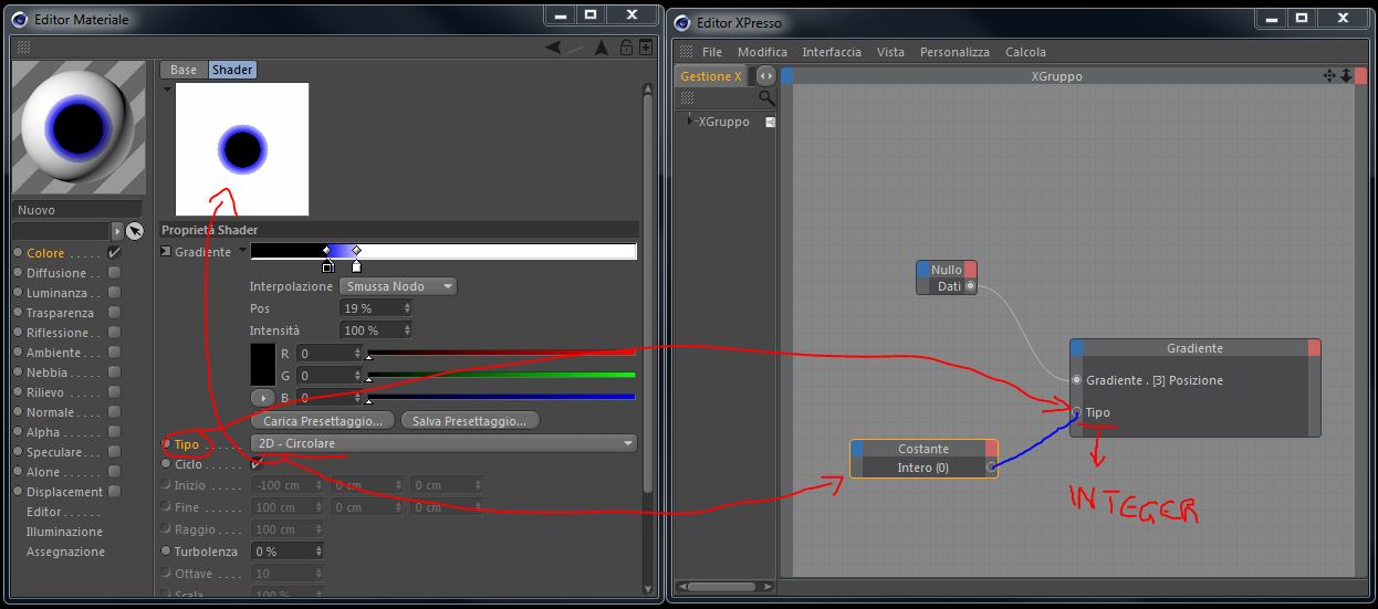 ok, seriamente... Sto realizzando una texture da variare nel tempo, ho fatto un'espressione per cambiare la posizione degli indicatori del gradiente, ma non riesco a capire che tipo di dati devo passare alla porta "Tipo" del nodo gradiente, premetto che la porta è di tipo integer e quindi numerica, ho provato ma evidentemente non è questa la soluzione, ho anche provato a passare dati tipo stringa (2D - Circolare), ma nemmeno così succede nulla.