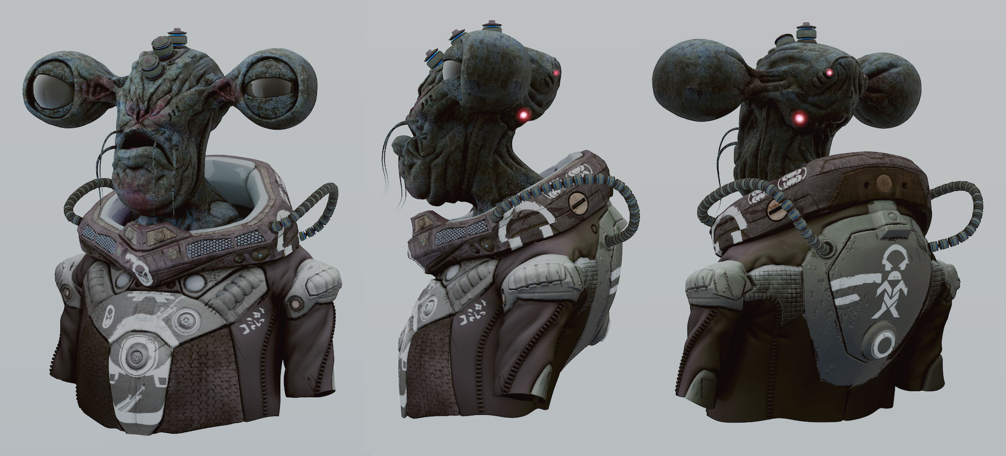 In questo caso è inserito in un ambiente neutro, quindi le riflessioni sono "nulle" e per il render finale ho abilitato il SSS sulla pelle e sulla parte gommosa della tuta che rendono molto meglio.