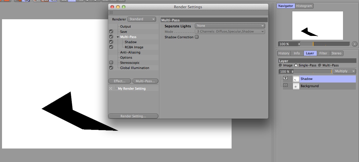 dagli screenshot mi pare che tu abbia attivato il Separate Pass negli attributi della luce ma probabilmente quello che cerchi è il pass generale delle ombre. Prova a togliere quell'opzione dalla luce, dalle opzioni del multipass metti Separate Lights su None ed aggiungi invece il pass Shadows.