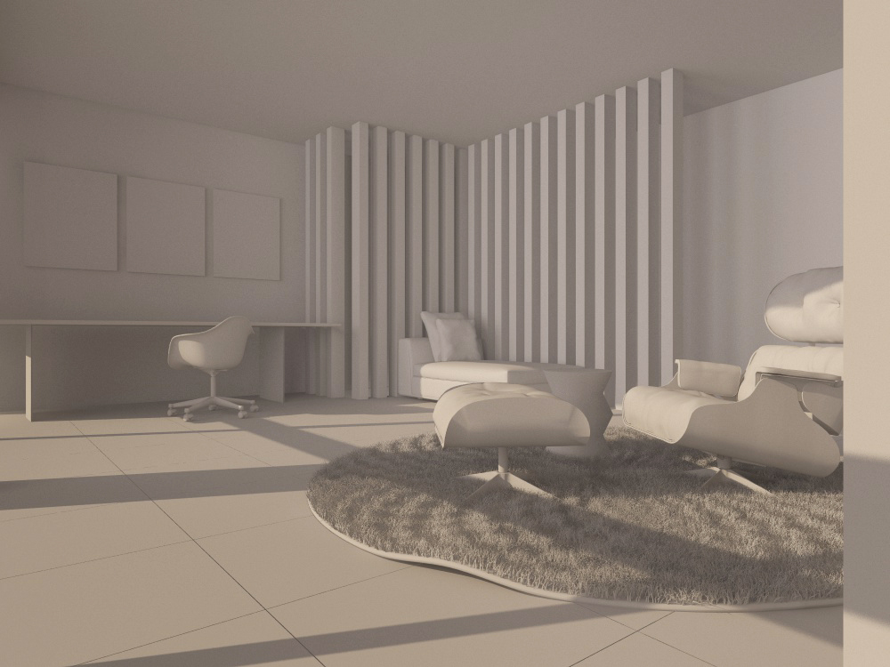 Piccolo up. Ho riregolato le luci come spiegato da enzo_87 :oops: , basandomi anche sull'immagine che poi avrò come orizzonte e ho cercato di modellare quasi tutto (non sono miei solo le sedie, il sofa, le posate e la longue chaise degli Eames).