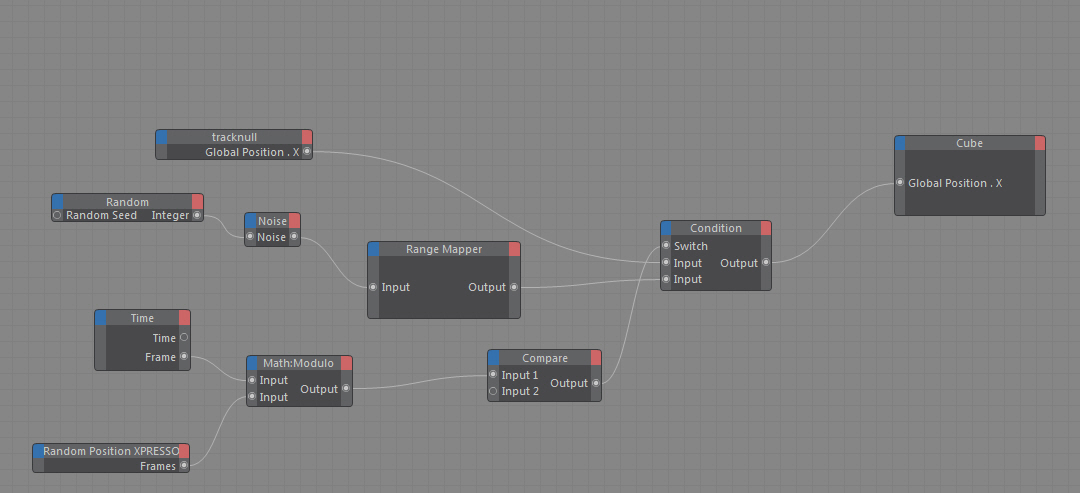 What I'm trying to achive is to generate a random number, then add that number to the current position of the cube and hold it there until I get the next random number after the n-th frame. I assume there's some programming involved? It seems like a loop, that doesn't work, if I need to take the x-pos from a cube to add it to a random number and plug it back into the x-pos of the cube. I need to find a way to get the position of the cube just for the n-th frame. Can anyone help me out on this?