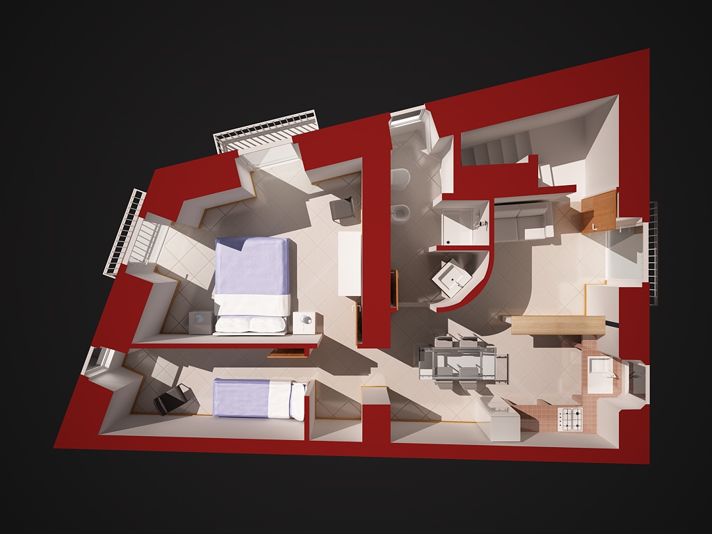 sto cercando di realizzare delle viste planimetriche di appartamenti per un mio amico che ha da poco aperto una agenzia immobiliare e siccome deve appendere i cartelli con le offerte in vetrina gli ho proposto di realizzare per lui, al posto delle scialbe planimetrie catastali, delle viste realizzate in cinema.