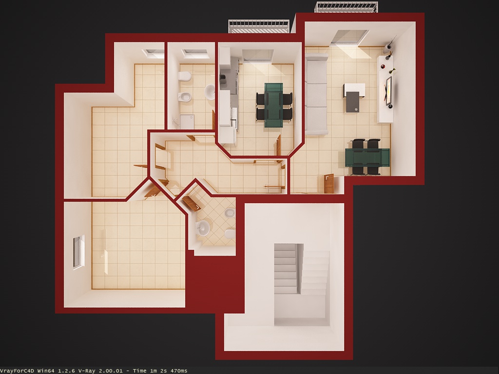 in questo nuovo appartamento, la differenza sostanziale è che il tetto che ho usato è anche leggermente luminoso, così ho schiarito l'intero appartamento senza dover ricorrere a troppi artefatti con la camera o con il color mapping.