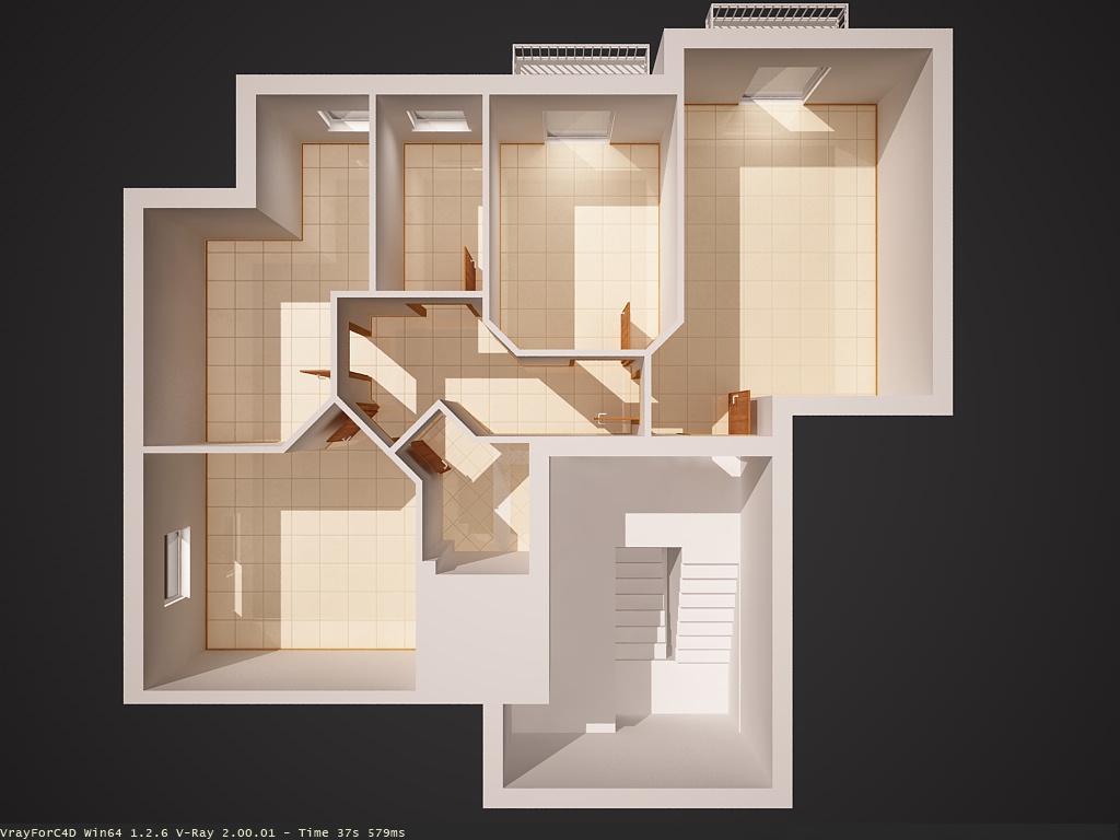 in questo nuovo appartamento, la differenza sostanziale è che il tetto che ho usato è anche leggermente luminoso, così ho schiarito l'intero appartamento senza dover ricorrere a troppi artefatti con la camera o con il color mapping.
