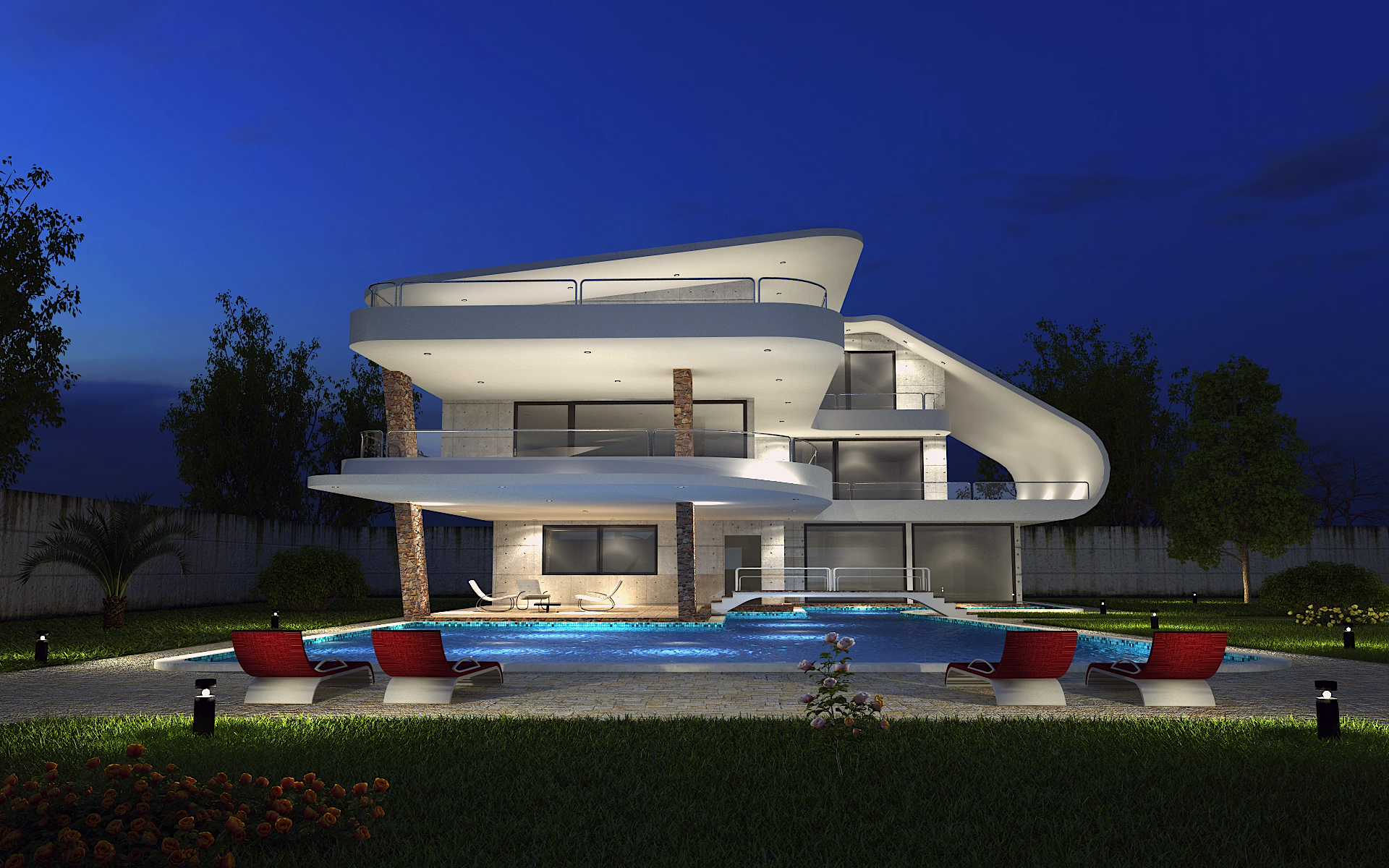 Ciao ragazzi, ho ripreso un mio vecchio progetto, per l architettura mi sono basato su un immagine di una casa trovata sul web, mentre per quanto riguarda l illuminazione ho preso spunto dalla bellissima immagine di Vitt23 presente nella galleria a pagina 3, naturalmente neanche a paragone con l immagine di Vitt23..magari essere a quei livelli! X l erba provvisoriamente ho messo una tex, in previsione poi di crearla con il fur o fast and fur, che dite? Creo un tassello e poi Duplicatore con istanza di render attivato? L illuminazione è data dall immagine sullo sfondo caricata nel back env e dalle luci ies tante quanti sono i faretti, cioè 48.
