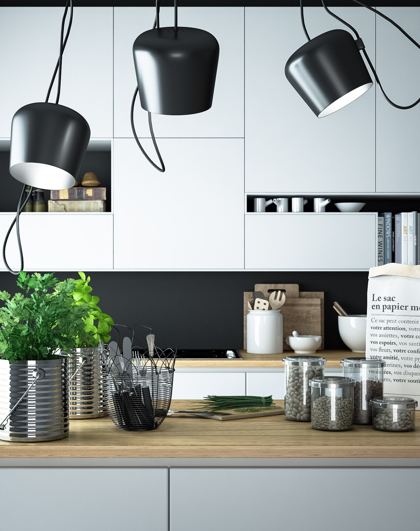 Le lampade forse un po' più piccole sarebbe meglio, mentre il tagliere lo ingrandirei un po' e visto che c'è già della roba tagliata sopra gli metterei anche un coltello vicino; nei vasi sulla destra cosa sono fagioli? Dagli il colore appropriato sembrano sassolini!