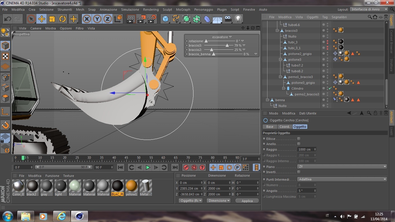 Spero di aver fatto giusto però come si vede non so come legare la benna, e fare lo spostamento con lo slider braccio benna,i cerchi indicano il centro dell'asse. Grazie