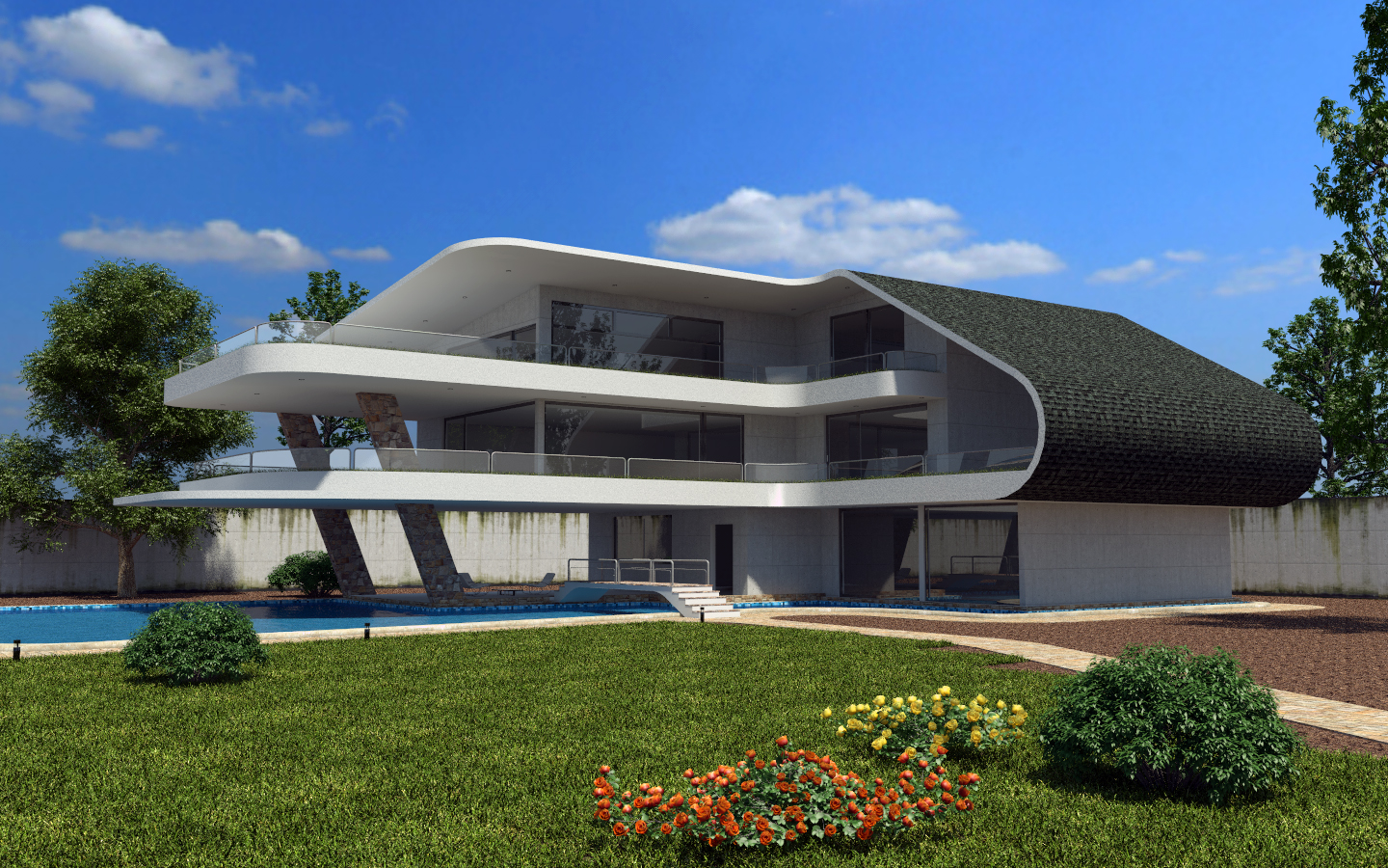 Ciao ragazzi, qualche tempo fa ho postato delle immagini di questo progetto in versione notturna, ora ho deciso di farne una versione diurna, cosa vi sembra come inizio? Ho steso qualche tassello d erba ( il modello principale appartiene alla galleria dell HQ Plants, poi duplicatore e ist rend attivata, tex in proiez cubica), giusto x avere un vostro parere. Il tetto fa schifo, non saprei come farlo...consigli? Tutto nero come per simulare della guaina?