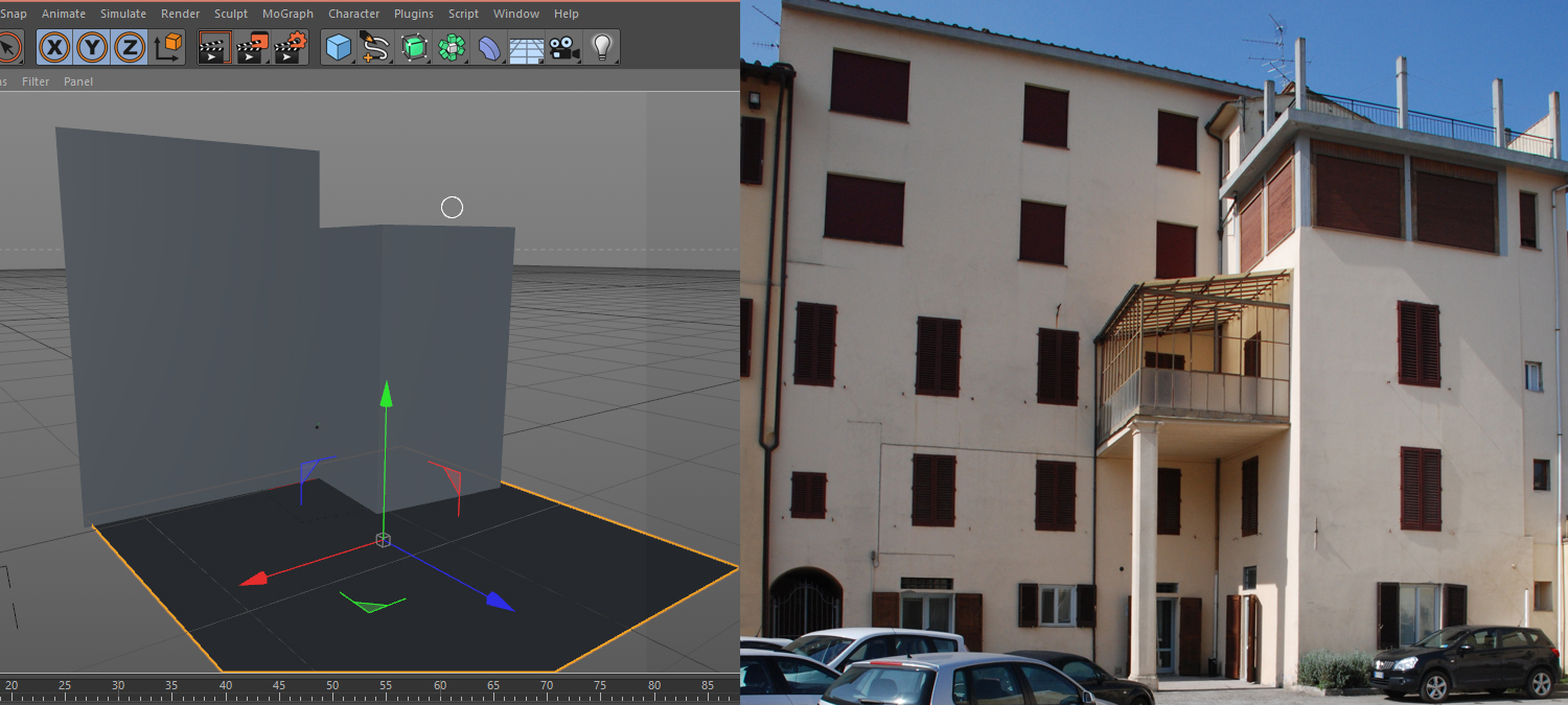 Un paio d'anni fa seguii un corso di cinema in cui mi fu accennato della possibilità di aggiungere una foto con camera calibrator per poter usare poi come sfondo ma dopo aver trovato qualche tutorial relativo a questo inserimento non ne sto venendo a capo perché la texture sfondo che mi si va a creare non corrisponde con l'edificio.