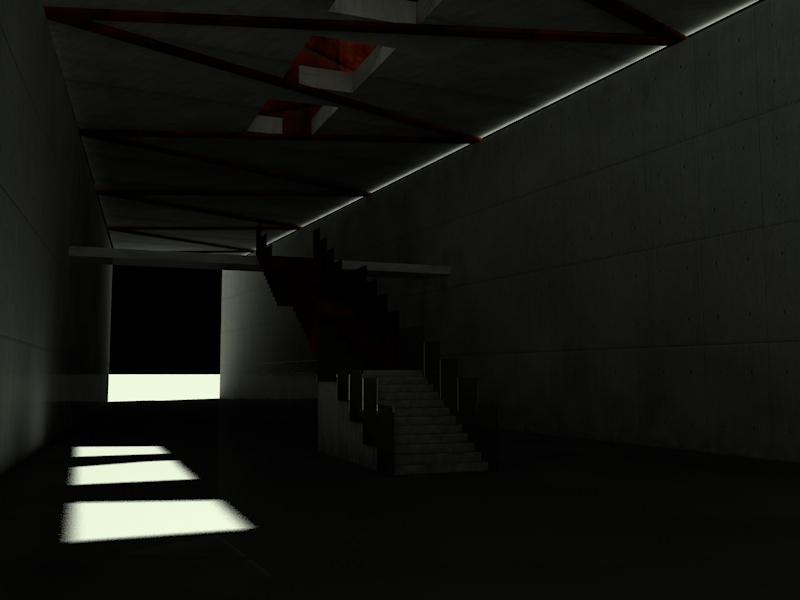 Come illuminazione inserisci il Cielo Fisico e basta, cercando di trovare l'ora giusta per far entrare i raggi del sole dalle bucature (oppure ruoti il cielo fino alla posizione giusta