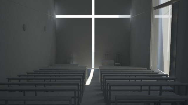 luci area al 50 per cento di intensità tranne le luci area della croce (intensità a 100% e filtro cool white) e quelle della vetrata di destra (65% e filtro cool white)