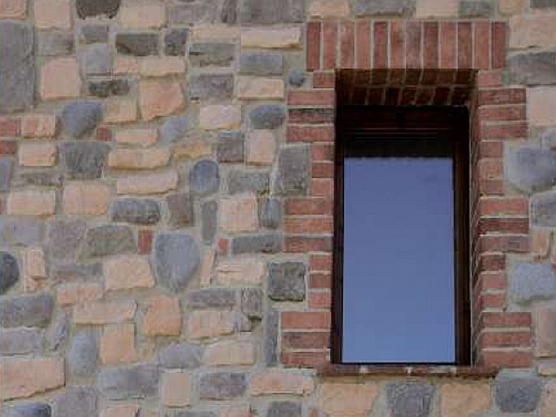 se la parete è chesso 2 metri x 2 metri io preparerei in photoshoè una texture pari pari con già posizionata pietra e mattoni così come li vuoi tu, poi mi ricaverei la versione per il rilievo e la applicherei all'intera parete