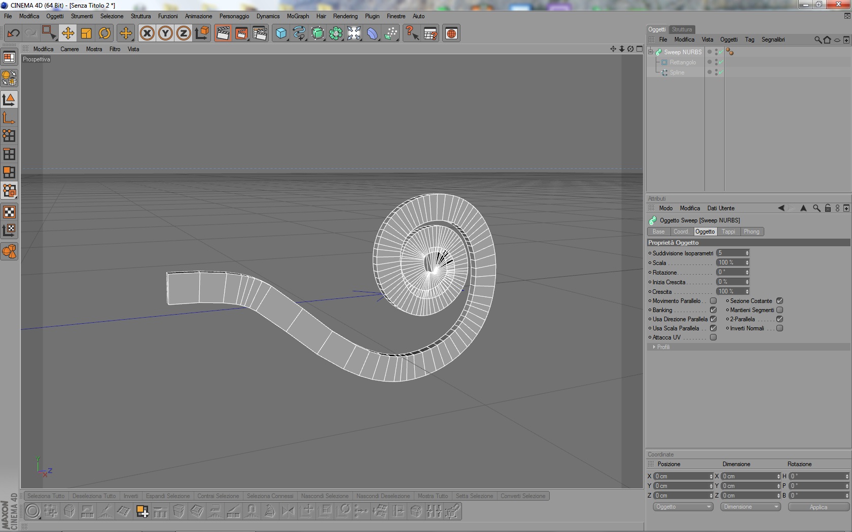 1. se uso una sweepnurbs il rettangolo posso scalarlo ma non posso schiacciarlo durante il percorso (la spirale)!!!