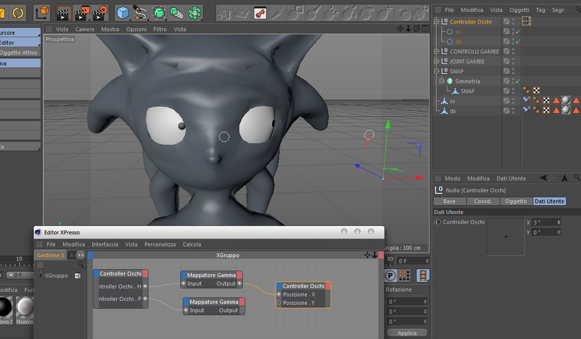 - Una volta mappato in Xpresso guardate la differenza di posizione da -3° a 3°, gli occhi non hanno la stessa direzione