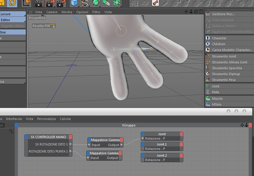 Ciao ragazzi,anche questa mattina mi sono imbattuto in uno dei video di Arkimed , tutto perfettamente chiaro tranne un risultato che non riesco ad ottenere riguardante il rig finale delle dita,una volta che collego il range mapper dell'SX CONTROLLER DITO 1 alla rotazione P di "Joint" guardate dallo screen cosa succede,al posto di seguire la rotazione sull'asse X se ne va per cavoli suoi in maniera distorta,è l'unico problema che ho,riguarda forse l'asse ? Aiuto !