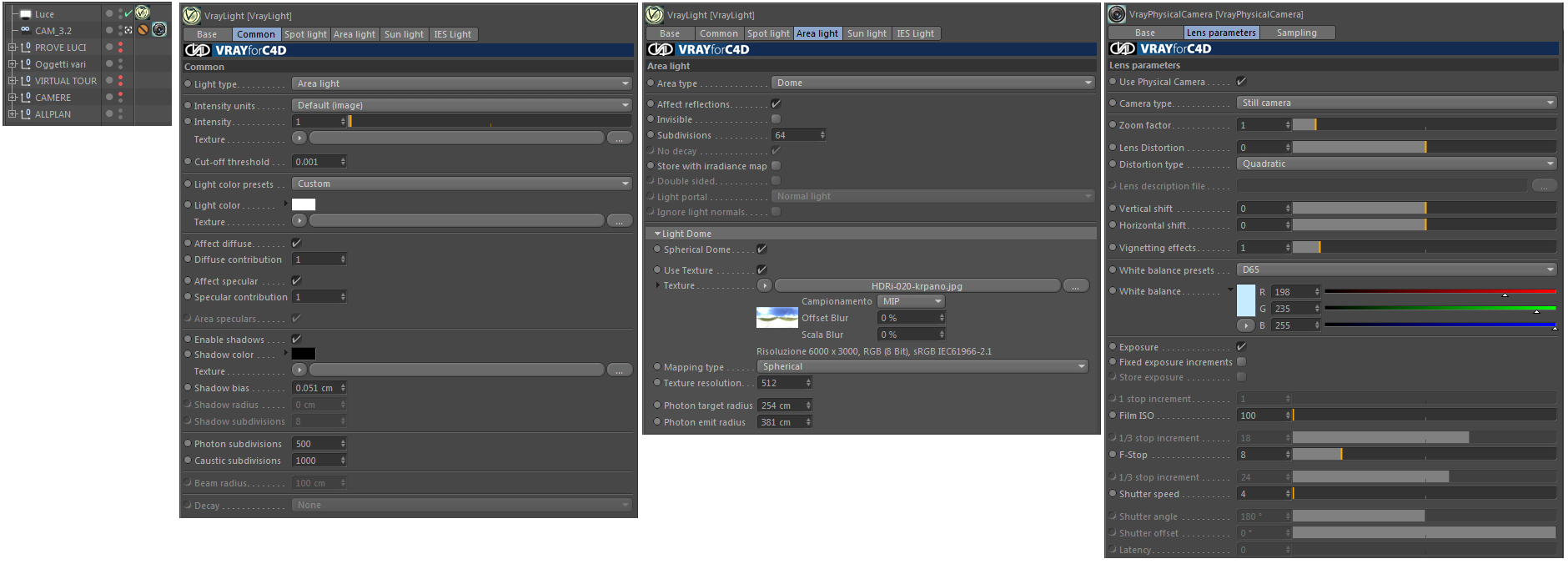Sirio76 wrote:Per evitare problemi, spegni il sole(o altre possibili fonti luminose, inclusi i canali dell'environment che devono essere neri), crea un'area light, setta l'intensità pari ad 1, attiva le ombre, setta su dome, aumenta le suddivisioni a 64(come punto di partenza), inserisci un'HDR di qualità (ne trovi anche di gratuite in giro) all'interno di un vrayadvbitmap shader e porta la gamma dell'HDR a 0.75/0.7, usa il domelight viewer(tra i plugin di vray) per previsualizzare l'immagine HDR e ruotare la fonte luminosa a tuo piacimento, e almeno all'inizio lascia visibile lo sfondo dell'HDR. Per variare la luminosità della scena prima di intervenire sull'intensità dell'area light meglio lavorare sulla physical camera.