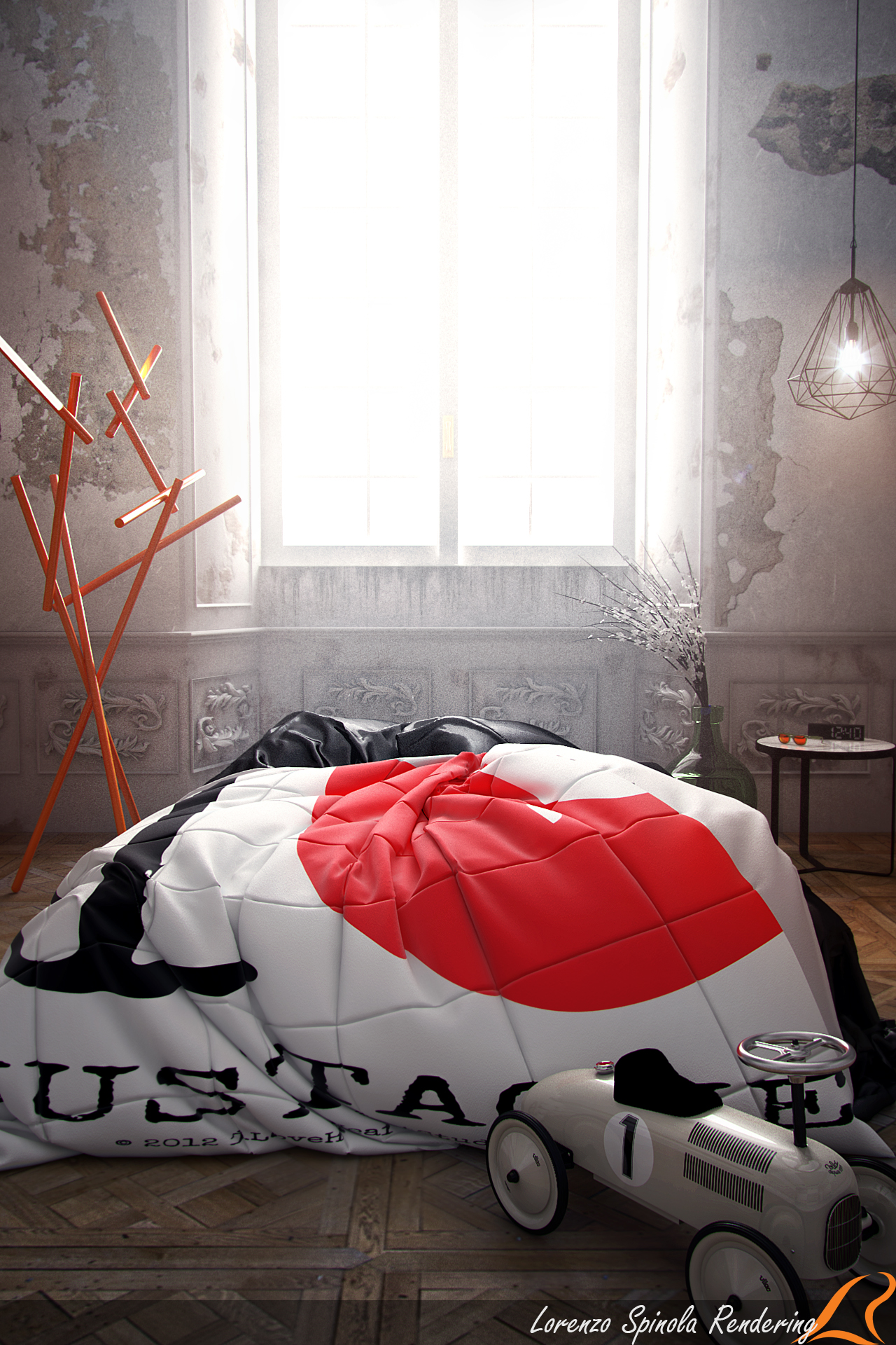 Quello che non mi convince pienamente, parlando da un punto di vista di composizione estetica della scena, sono alcuni dettagli: per primo quello che sembra un attaccapanni (arancione) vicino al letto, non ne vedo il motivo e si prende troppa importanza, meglio un comodino, un quadro, un attaccapanni basso con qualcosa buttato sopra... inoltre il colore stacca troppo dalle tonalità tenui del resto dell'immagine e gli fa guadagnare troppa importanza.