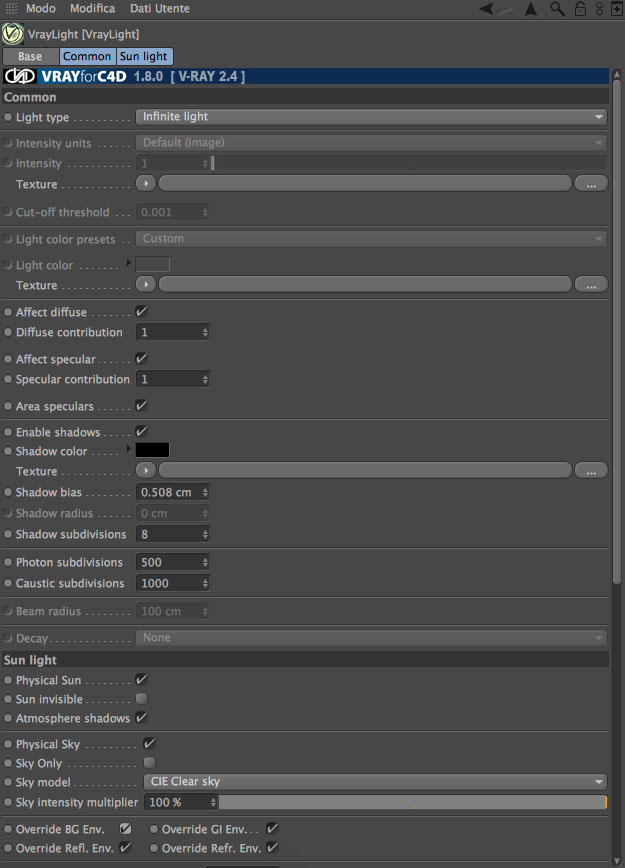 luce infinita (physical sun+sky, deselezionando "Override BG Env.")