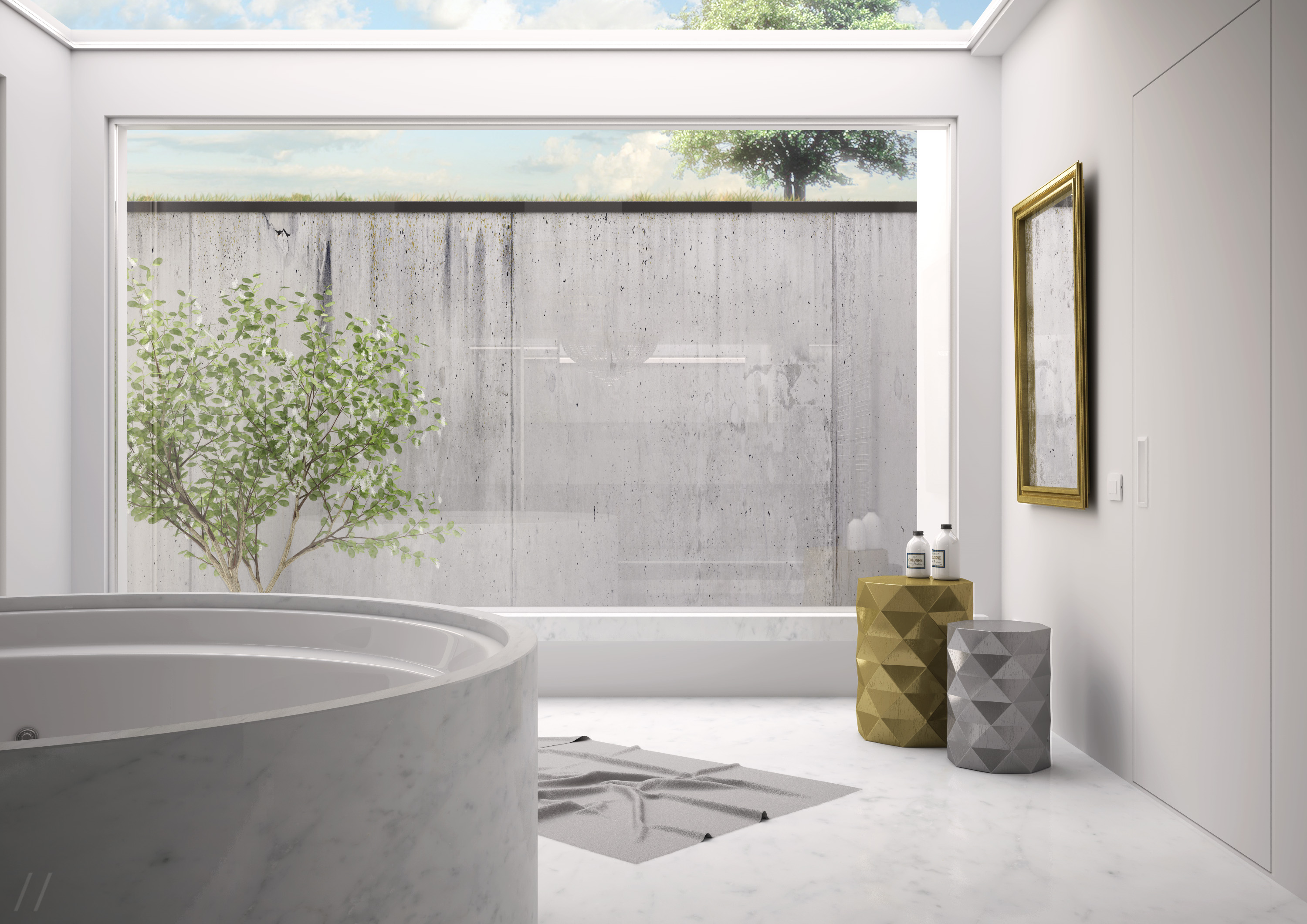 La vasca poggerà su una struttura realizzata ad hoc in calcestruzzo e metallo, senza sollevarsi troppo dal massetto in modo da consentire l'accesso alla vasca senza inserire gradini.