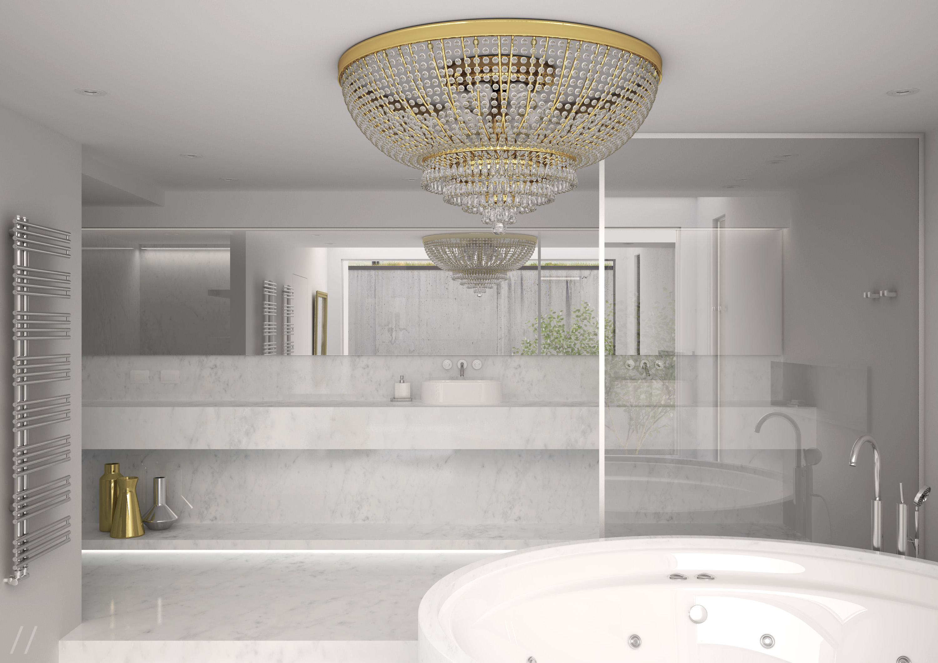 I modelli dei lavabi, del bidet e del wc (che non si vede :) ) sono gentilmente forniti dalla Simas, la vasca da bagno e i due scaldasalviette sono librerie free. Il tappeto è stato realizzato con MD3, i due sgabelli e lo specchio in box modelling.