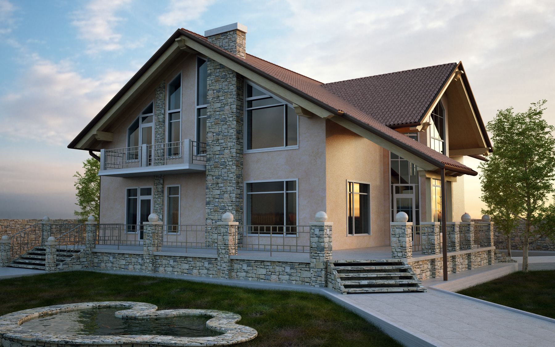 P.S.: cerca di fare attenzione alle ombre portate dalle tue HDR. In alcuni renders ci sono incongruenze, tipo ombre nette con cieli nuvolosi e ombre appena percettibili con cieli nitidi. Osserva la realtà. Cercherei anche di evitare lo sfondo portato dall'HDR al di sotto dell'orizzonte, non ha abbastanza risoluzione e pertanto appare eccessivamente sfumato, creando uno pseudo effetto di profondità di campo che fa sembrare la casa un modellino in scala piuttosto che un'edificio reale. Il tiling della pietra è troppo percettibile e lavorerei di più sull'erba. A parte questo complimenti per il bel lavoro