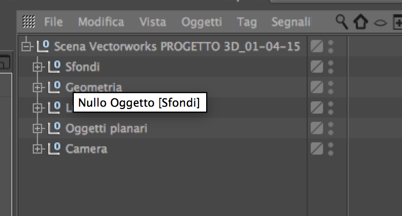 A questo punto in cinema ho un file di nome "scena vectorworks" che al suo interno contiene più gruppi e precisamente: sfondi-geometria-luci-oggetti planari-camera. Elimino tutto tranne geometria e selezionando le texture raggruppo gli oggetti per fare ordine nel file e poter così assegnare le texture di cinema in modo corretto.