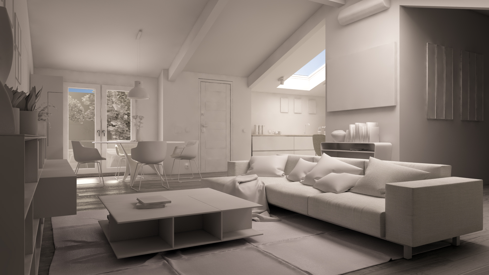 Perché non posti una foto della mansarda reale, riprendendola grosso modo dalla stessa angolazione? L'ideale sarebbe usare una reflex ma alle brutte anche una foto fatta con un buon telefonino va bene. Una volta fotografato l'ambiente, ti sarà più semplice vedere quale sia il vero comportamento della luce quando ripreso dalla fotocamera, e non ti resterà che imitarlo.