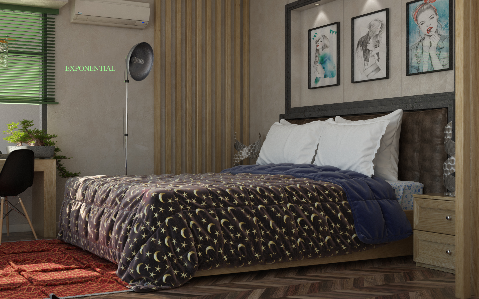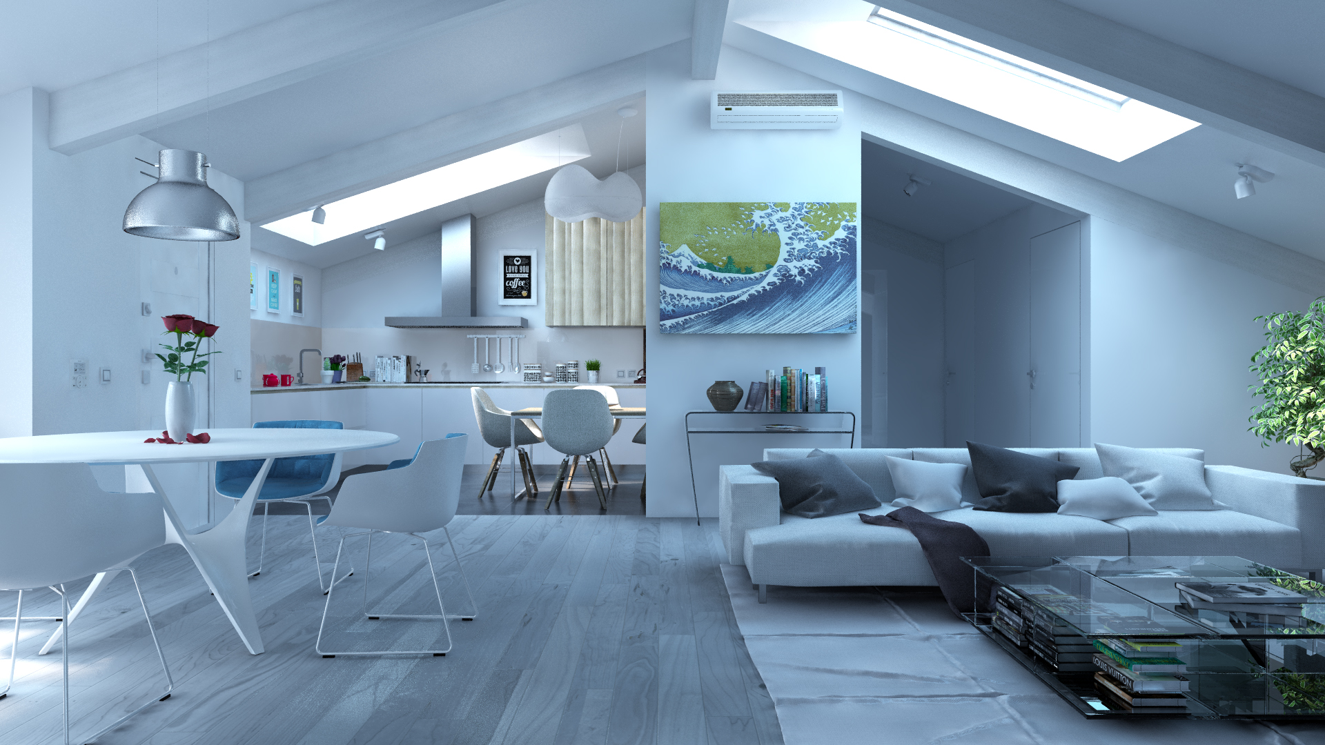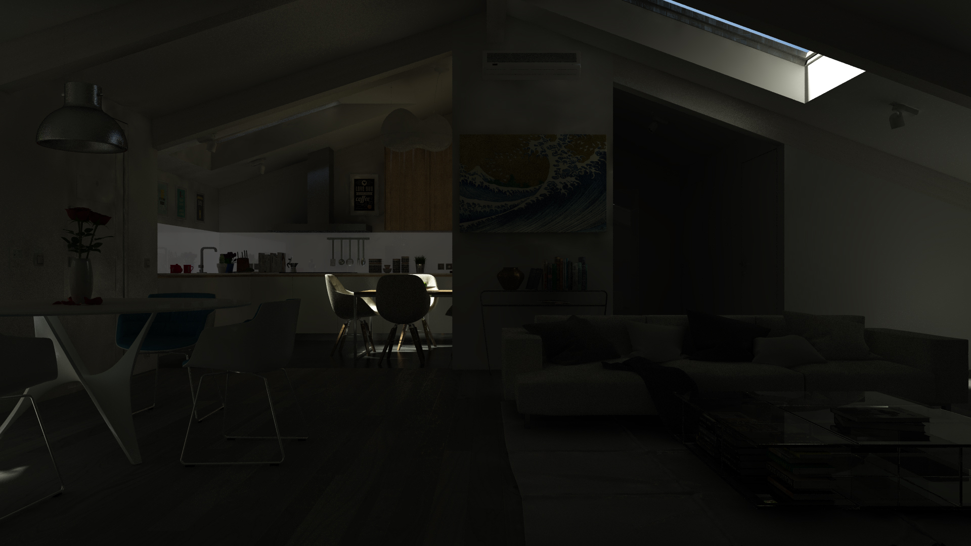 sto realizzando questo render interno di una mansarda di un amico e vorrei dei consigli perchè non mi convince del tutto.