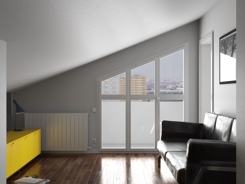 In un'ambientazione tanto piccola e spoglia cercherei di curare anche il più piccolo dettaglio in modo maniacale, iniziando dalla porta finestra che è l'elemento terminale della tua prospettiva. :roll: