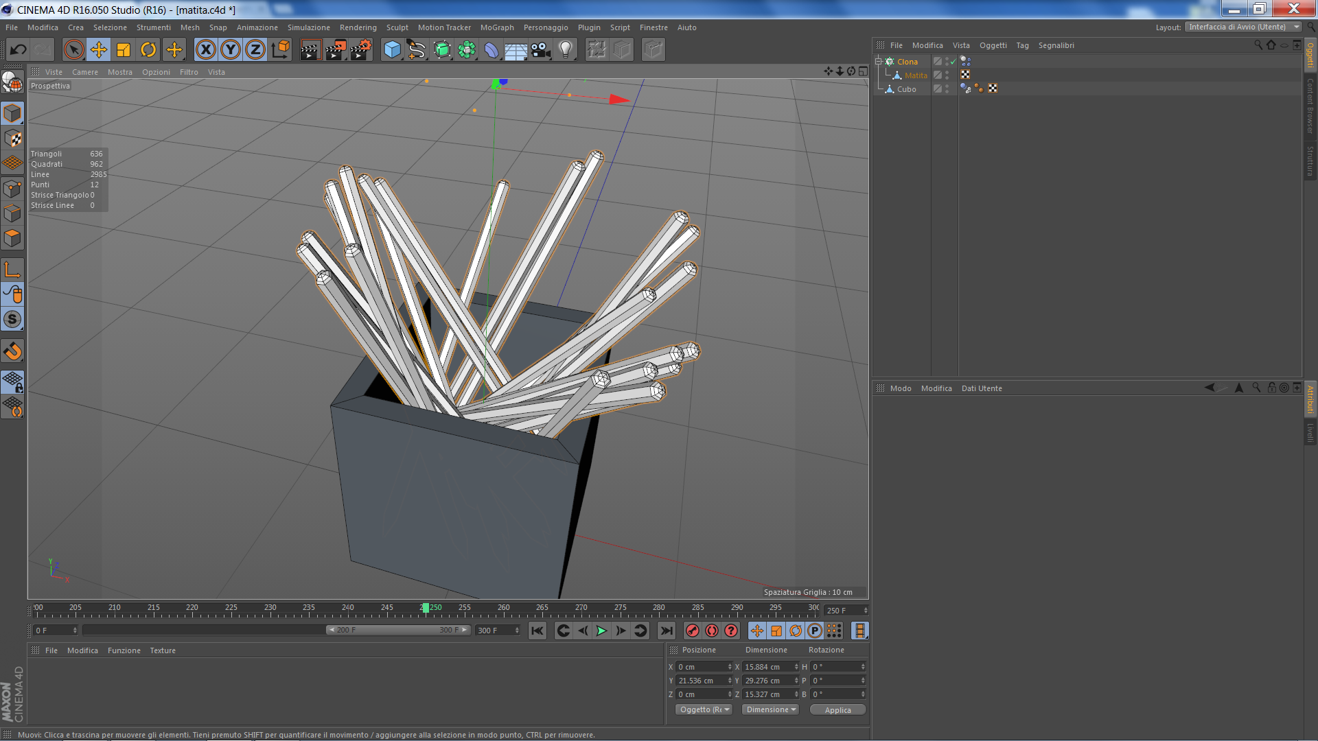 Modellati i vari oggetti riducendo al minimo i poligoni e la scatolina proprio base, sto provando ad usare le simulazioni di cinema per far cadere i vari oggetti dentro al contenitore, ma sorge un probblema: le matite non toccano il bordo della scatola ma restano a mezz'aria e non capisco il perchè.