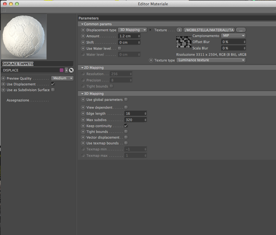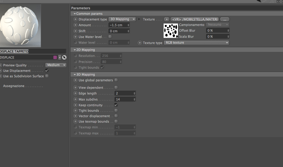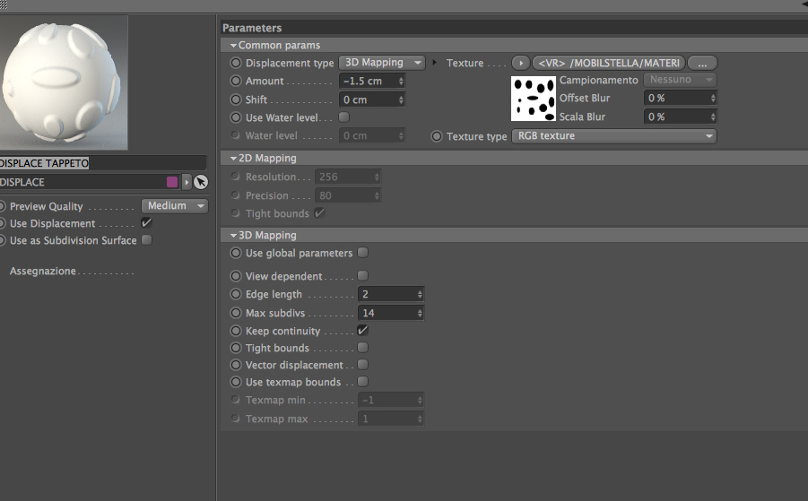 la mesh è un piano di cinema... notare le suddivisioni... il materiale è un semplice materiale displacement di vray, con dei settaggi parecchio basilari... in ogni caso come potrete testare da soli, l'unico modo per ottenere un risultato decente è aumentare le suddivisioni del piano.. se poi usiamo la mappa quella con le forme nette e non sfumate.. il risultato lo vedete da solo dalle preview postate...