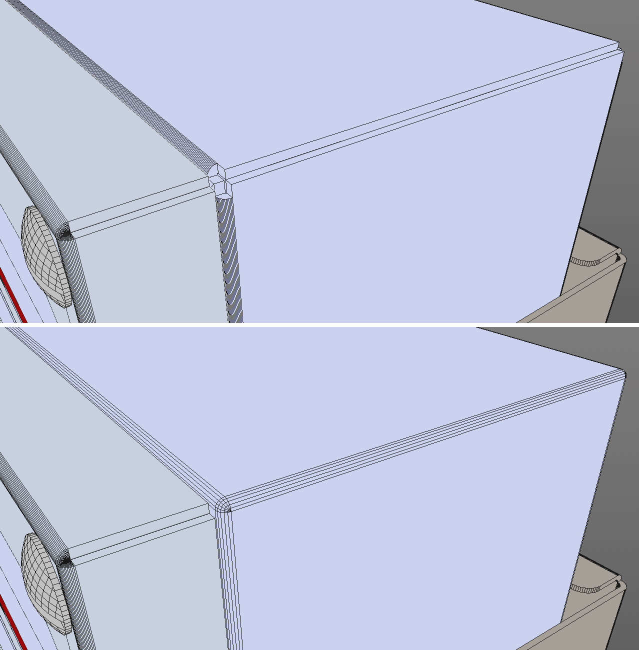 So come si fa lo smusso, ma in questo caso l'errore è nel modello originale che ho ricevuto, che presenta lo smusso in certi punti e non in altri, dove invece c'è uno scalino. In alcuni casi ho potuto ricostruire da zero le scatole facendo lo smusso, in altri (è qui il problema) devo usare le scatole originali perché contengono modellazioni particolari, che impiegherei molto tempo a ricostruire.Ma gli smussi in molti spigoli mancano o si interrompono.