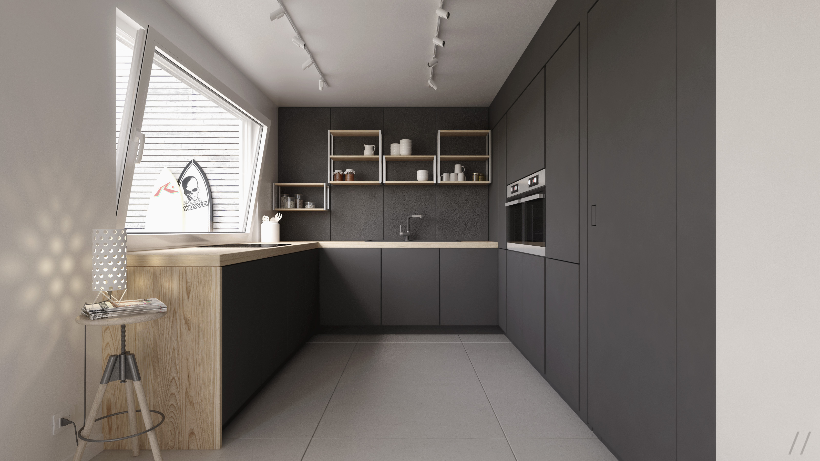 Per quanto riguarda invece gli accessori ho preferito stare il più minimal possibile, per sottolineare e rafforzare la natura contemporanea del progetto. Ad essere sincero col senno di poi manca qualcosa al centro del cestino sul tavolo, l'unica cosa che in realtà mi salta all'occhio.