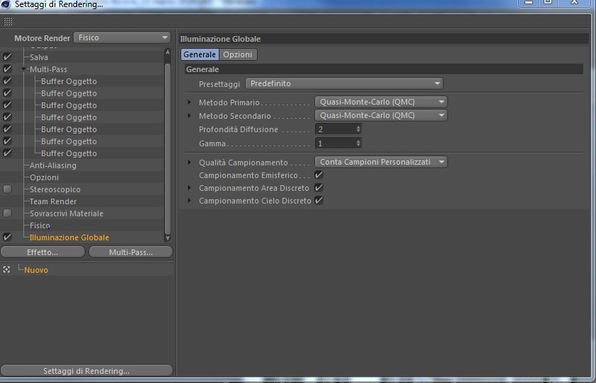 nel tuo caso che vuoi usare una HDRI dovresti impostare il presettaggio Esterno - Immagine HDR che prevede l'utilizzo di IR + QMC come metodi impostati rispettivamente come Primario e Secondario!